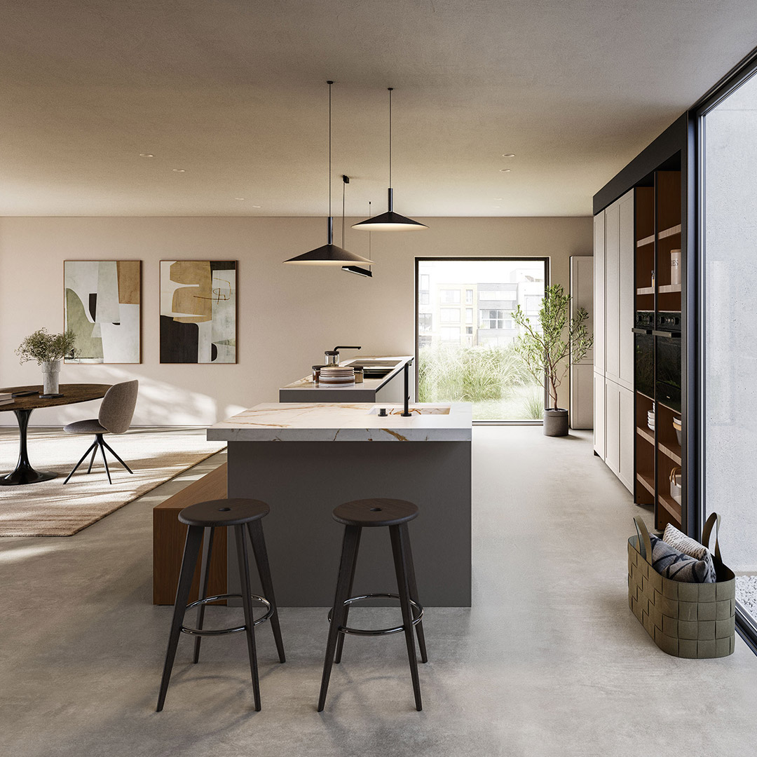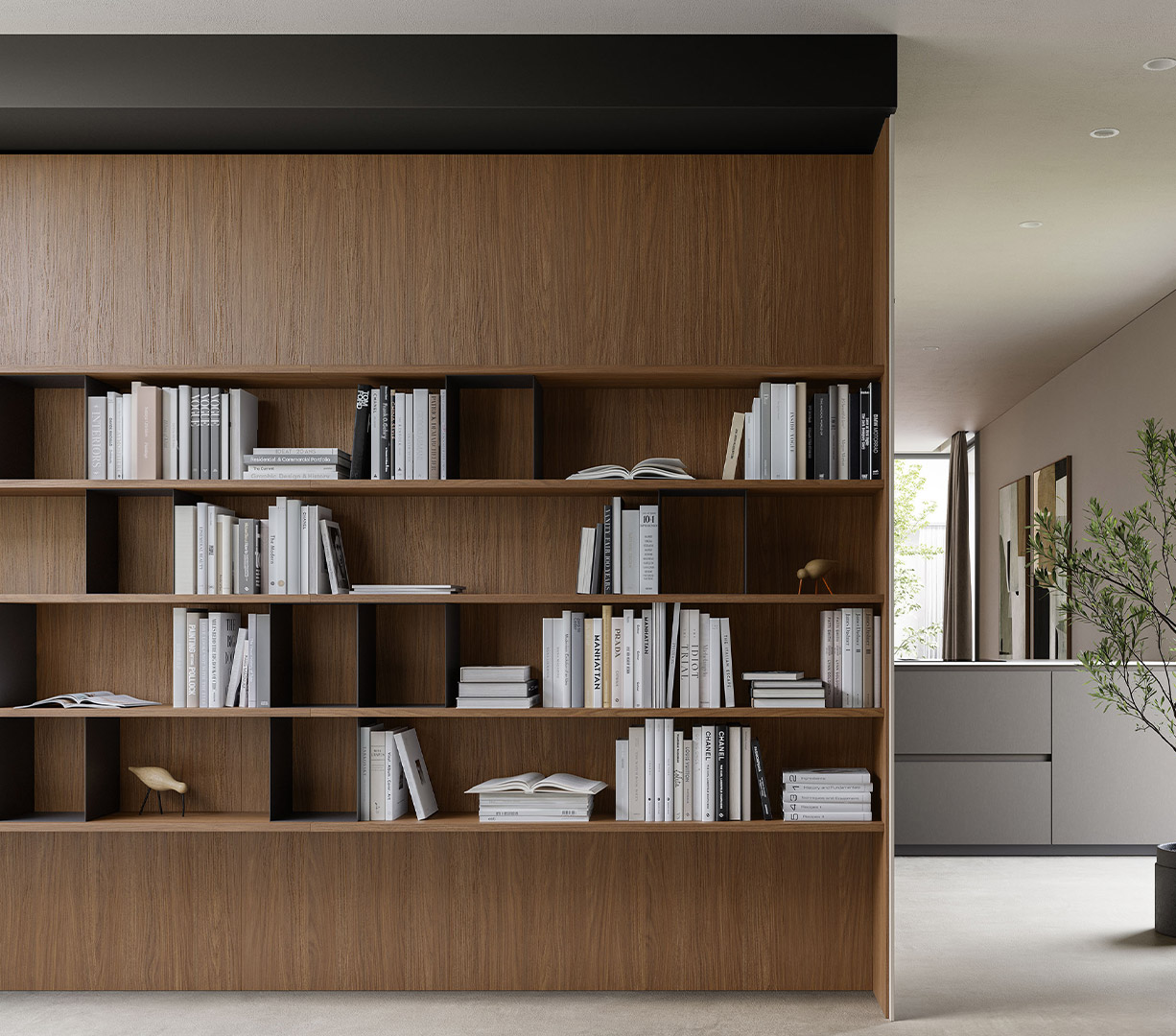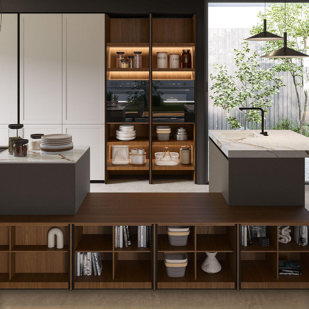 The balance of being. In a luxurious home, where architecture pays homage to harmony and tranquility, a Zen garden nestled at the heart of the house provides a haven for serenity and introspection. Here, residents nurture their physical and mental well-being, dedicating time to yoga practice in a dedicated space. The wall columns, featuring framed doors reminiscent of classic boiserie, serve as a seamless link between spaces, gracefully connecting the yoga area to the kitchen. Two interconnected islands create a harmonious interplay of volumes, mirroring the equilibrium that pervades the entire home. Every gesture, every breath, contributes to maintaining the balance of one’s being alive in this sanctuary of peace and mindfulness.