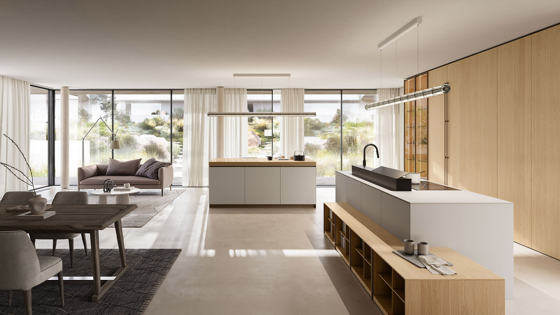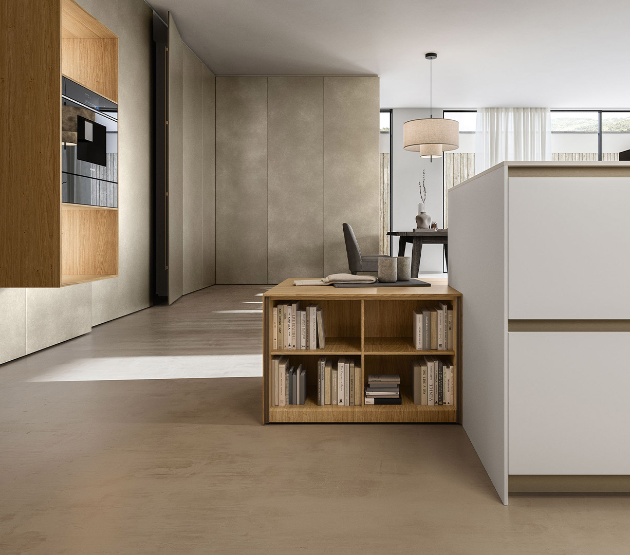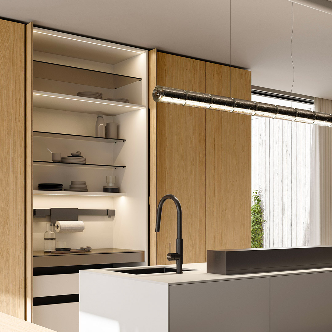 Island kitchen with White Ice Abitum top, 16 mm th. door in Neve satin lacquered finish. Pocket door tall unit with Preparation setup with 16 mm th. door in Oak Nordico finish and internal carcass in Neve satin lacquer finish.