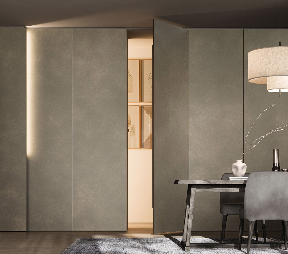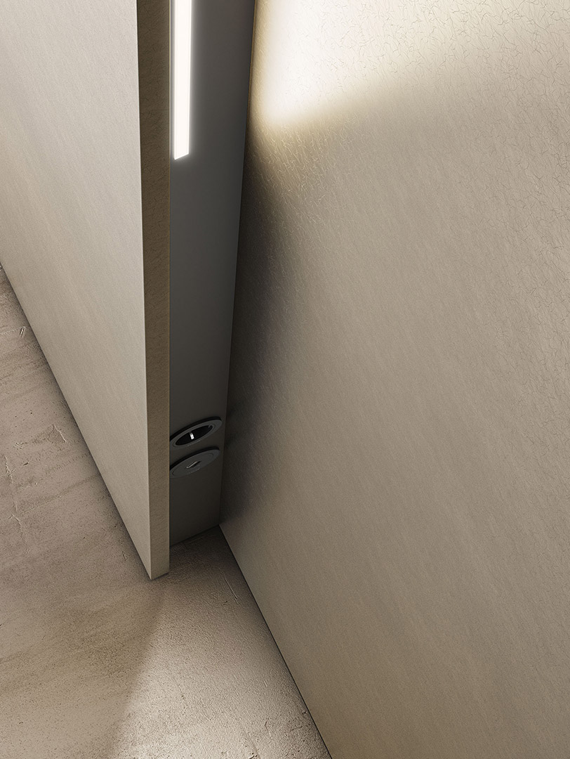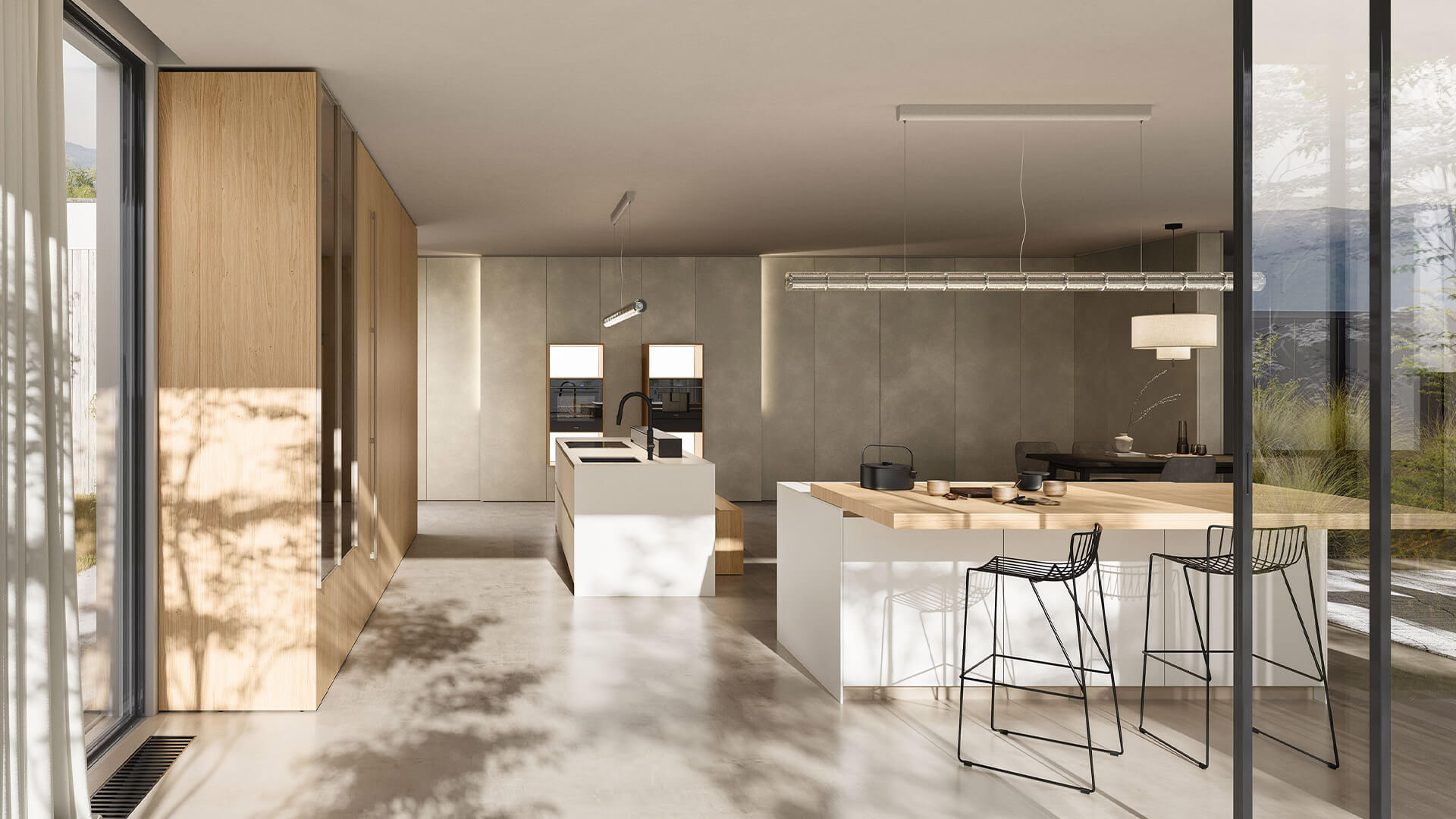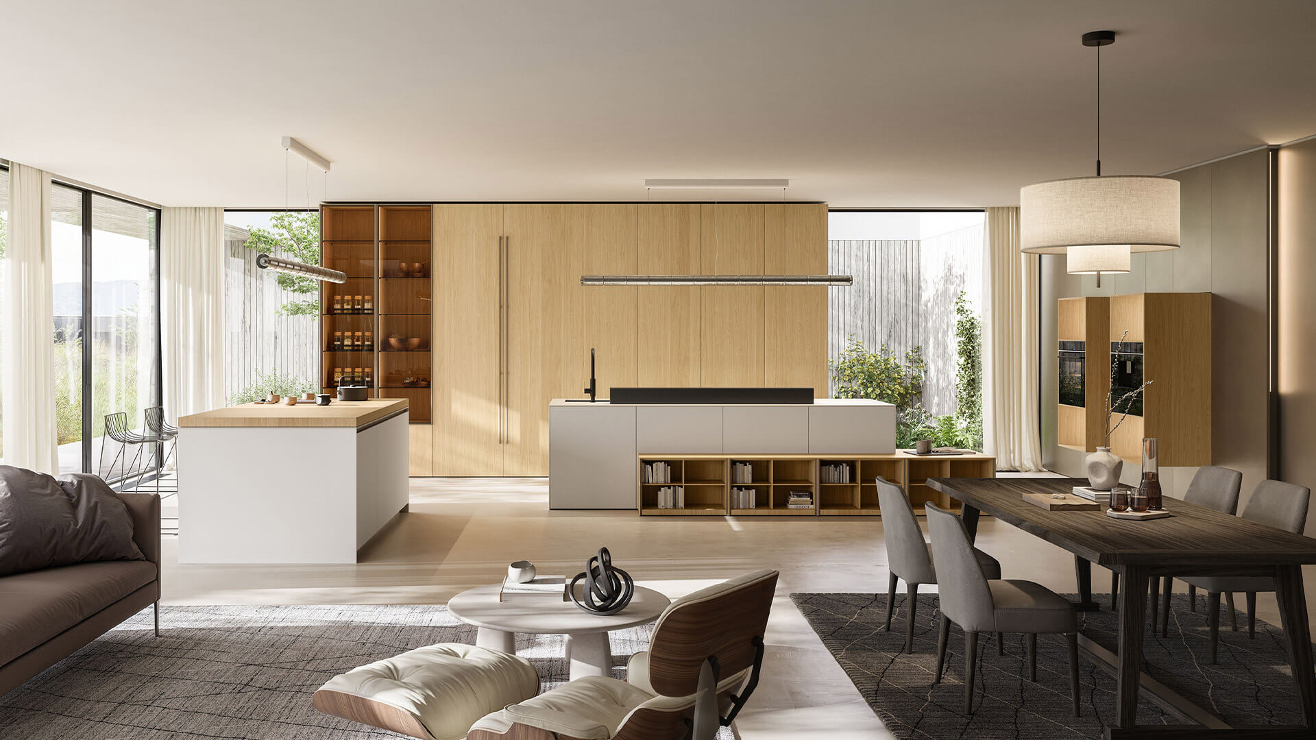 Island kitchen with White Ice Abitum top, 16 mm th. door in Neve satin lacquered finish. Pocket door tall unit with Preparation setup with 16 mm th. door in Oak Nordico finish and internal carcass in Neve satin lacquer finish.