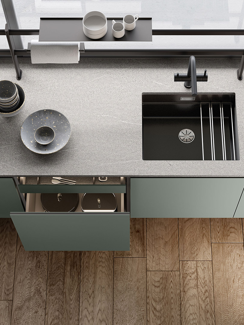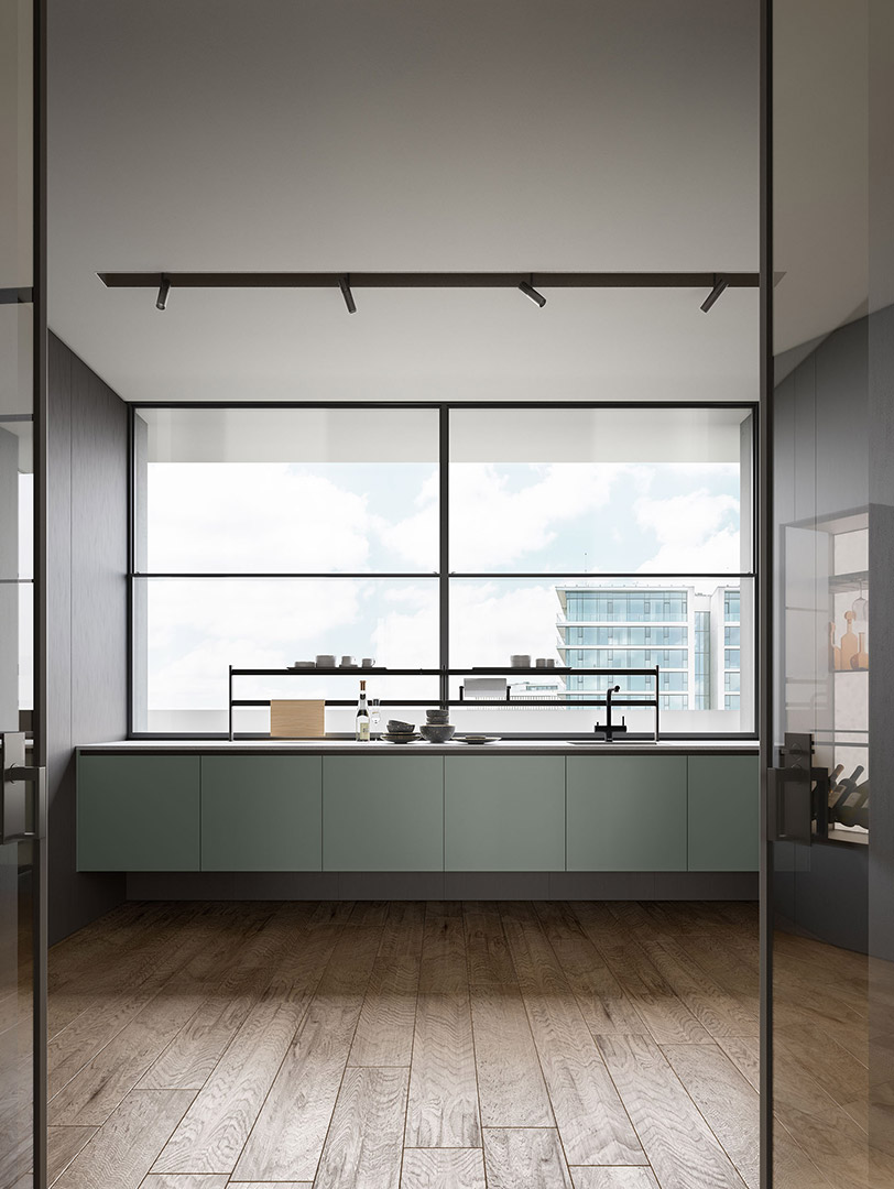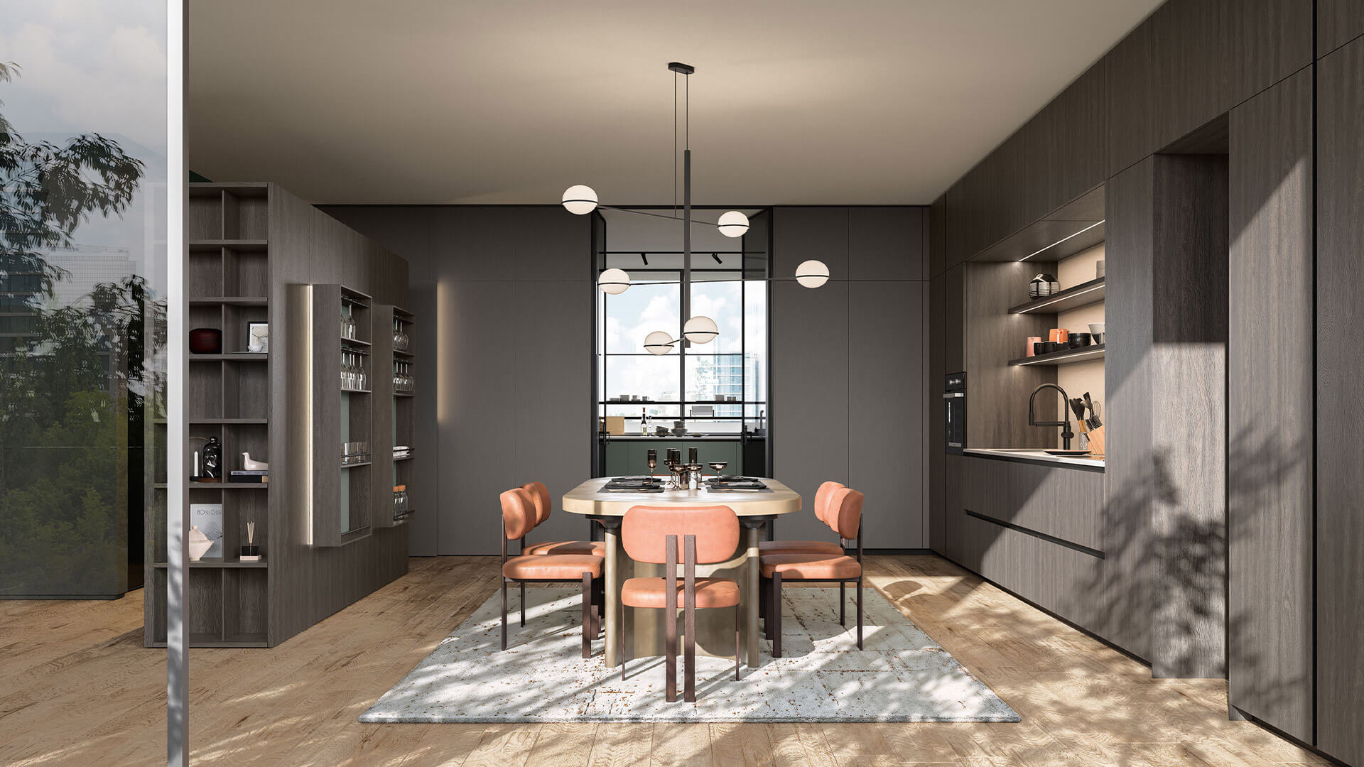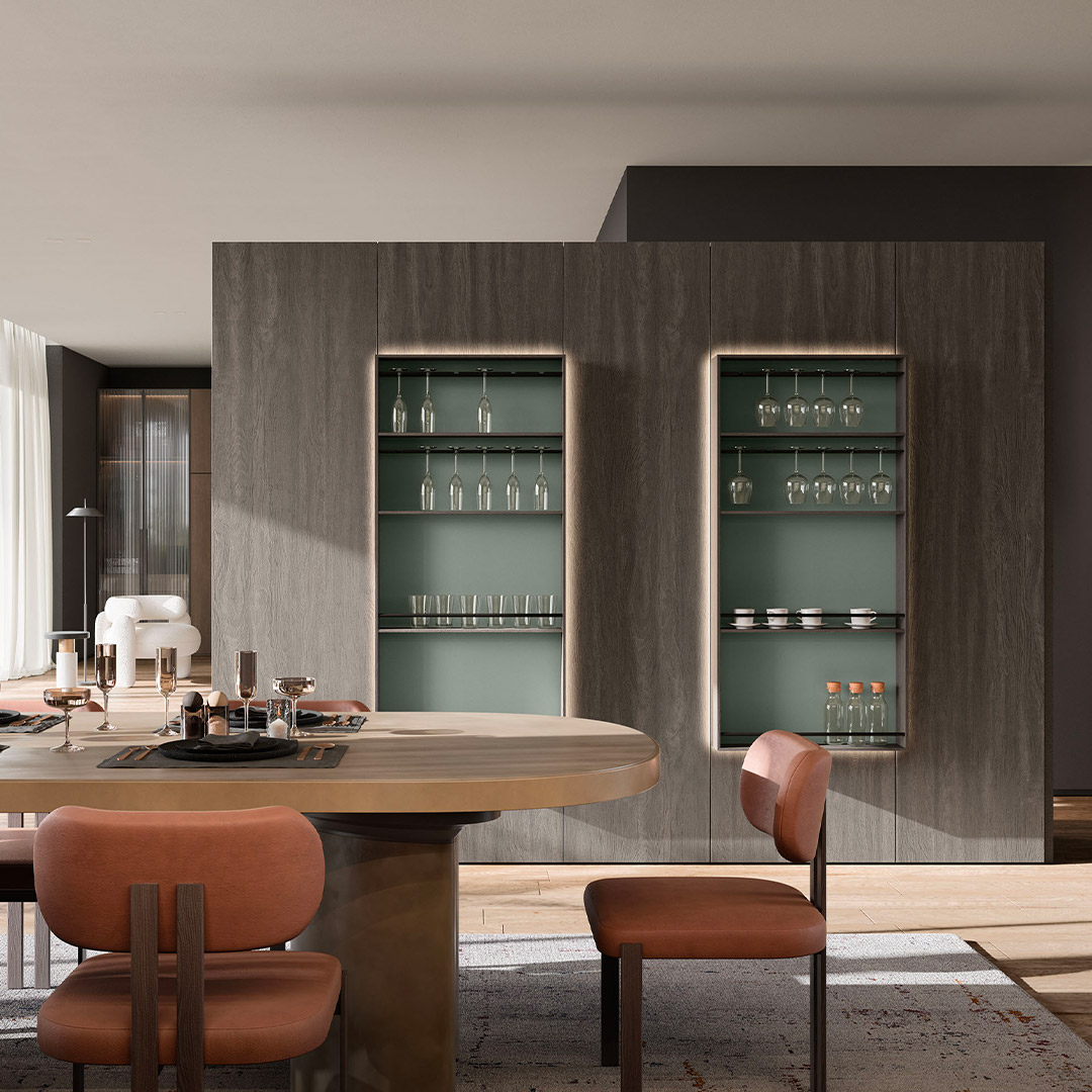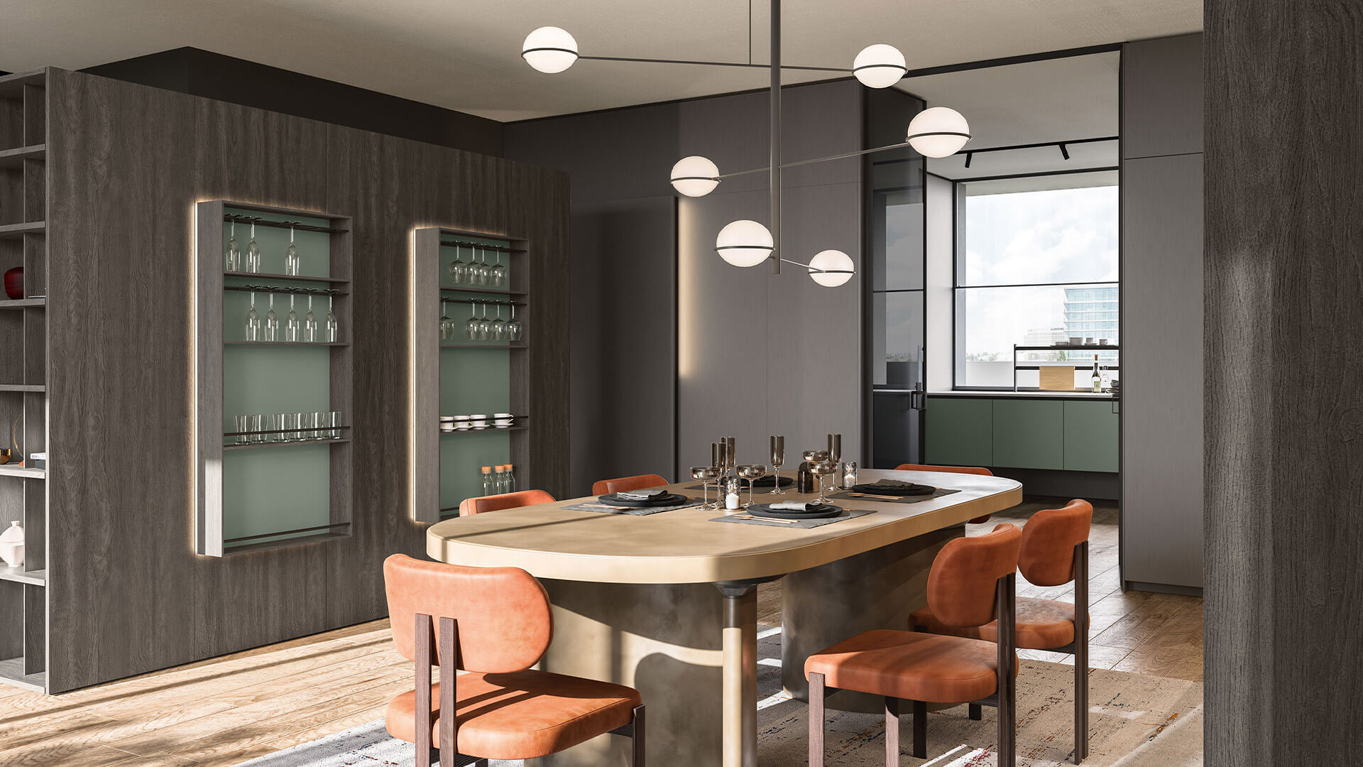 Like in a symposium. At the core of this apartment resides a gesture of love, an art expressed through the preparation of delights for others. Some seek innovation with daring recipes, while others embrace tradition with reliable results. Yet, regardless of the approach, the kitchen stands poised to elevate every dish into an unforgettable experience. These moments are treasures meant to be shared in good company, uniting family and friends around the table, where each flavor embarks on a journey through emotions and tastes. Here, every meal evolves into a spirited dialogue, a mosaic of thoughts, flavors, scents, and colors that enliven the senses and enrich the soul.
