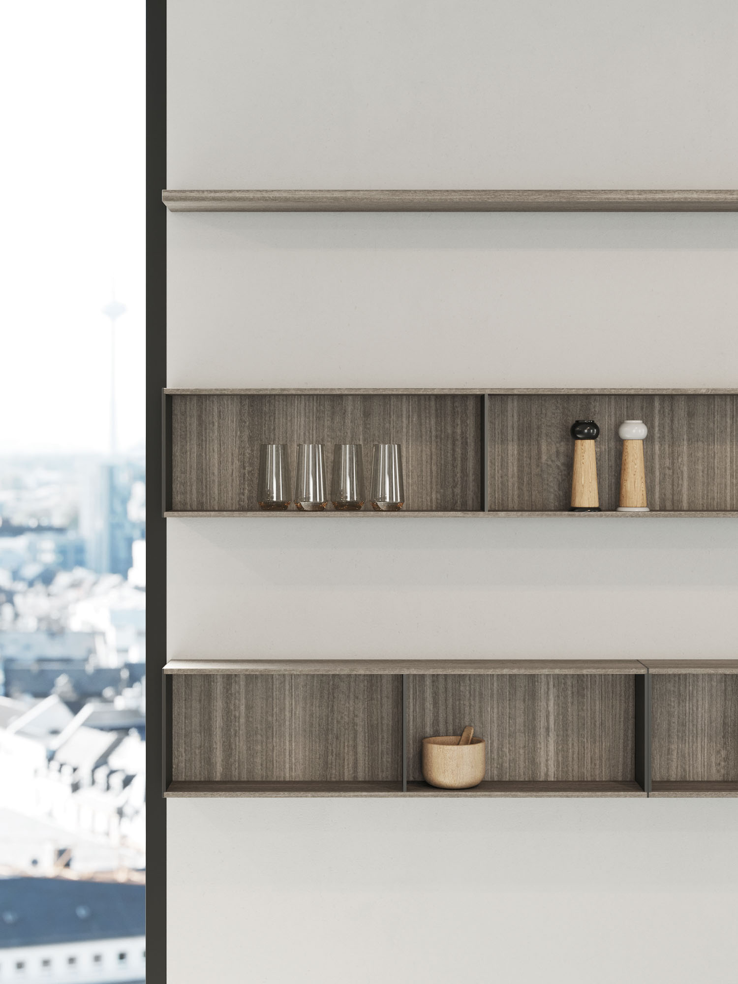 The Tuki family is enriched by this new element, whose lightweight design contributes to bringing rhythm and style to projects. It can be used both as an under-cabinet element and as an independent wall element. Its clean aesthetic, characterized by horizontal and vertical aluminum dividers, is supported by an invisible wall mounting system that further accentuates its lightness: Tuki 24 represents reliability and modularity condensed into just 24 cm of height