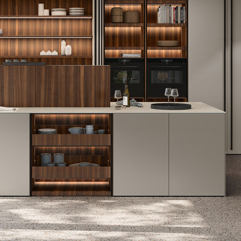 Clip Base provides an innovative connection between base units that defines and characterizes island or wall configurations. Equipped with drawers or shelves and integrated lighting, Clip Base not only offers essential storage functions but also adds a touch of style, lightness, and practicality to the kitchen environment, breaking the monotony of a succession of bases.