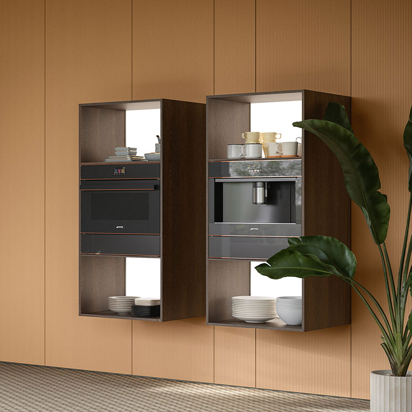 A suspended vertical or horizontal open element with defined volumes, Foomo is designed for the insertion of household appliances and can be accessorised with backlit back panels. Used semi-recessed, built-in or exposed, Foomo amazes with its defined geometries and essential functionality.