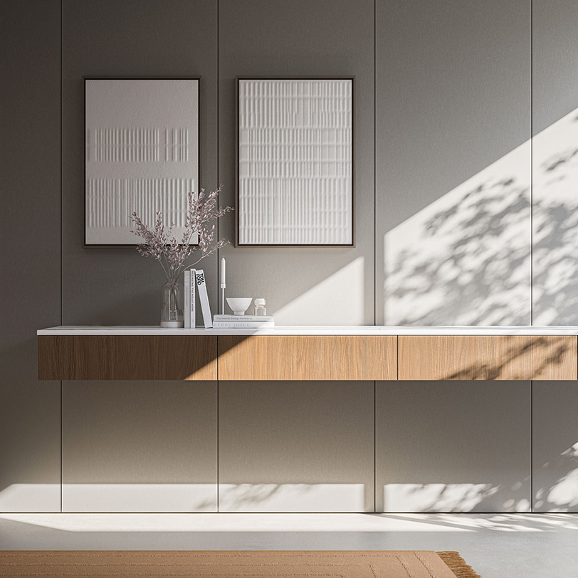 "Hof" is a suspended storage unit characterized by bold, slender lines and great visual lightness. It presents itself as a horizontal design element, modular in widths of 60, 90, and 120 cm. "Hof" is available with handles, grooves, or push-pull opening mechanisms. Its essentiality allows for versatile use in various domestic environments, offering furnishing solutions that expand the design possibilities within living spaces with Copatlife products.