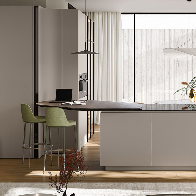 Link is a unique suspended element that incorporates a practical drawer and seamlessly connects two bases, providing a spacious work surface that can accommodate cooking functions and electrical sockets. Additionally, Link enables the use of stools, transforming it into a bar area. This highly versatile and adapt- able element is lightweight and perfectly suited to various configurations within the kitchen environment.