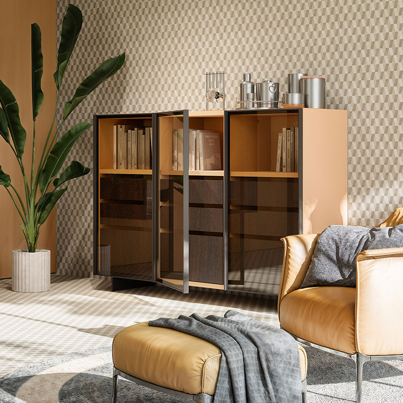 This elegant and spacious sideboard has been designed to offer a high degree of customization. Its 30 mm folding external structure defines the internal contents, ensuring a clean and tidy appearance. Inside, the lacquered drawers add a touch of sophistication, while the top pantry section offers a bold contrast.