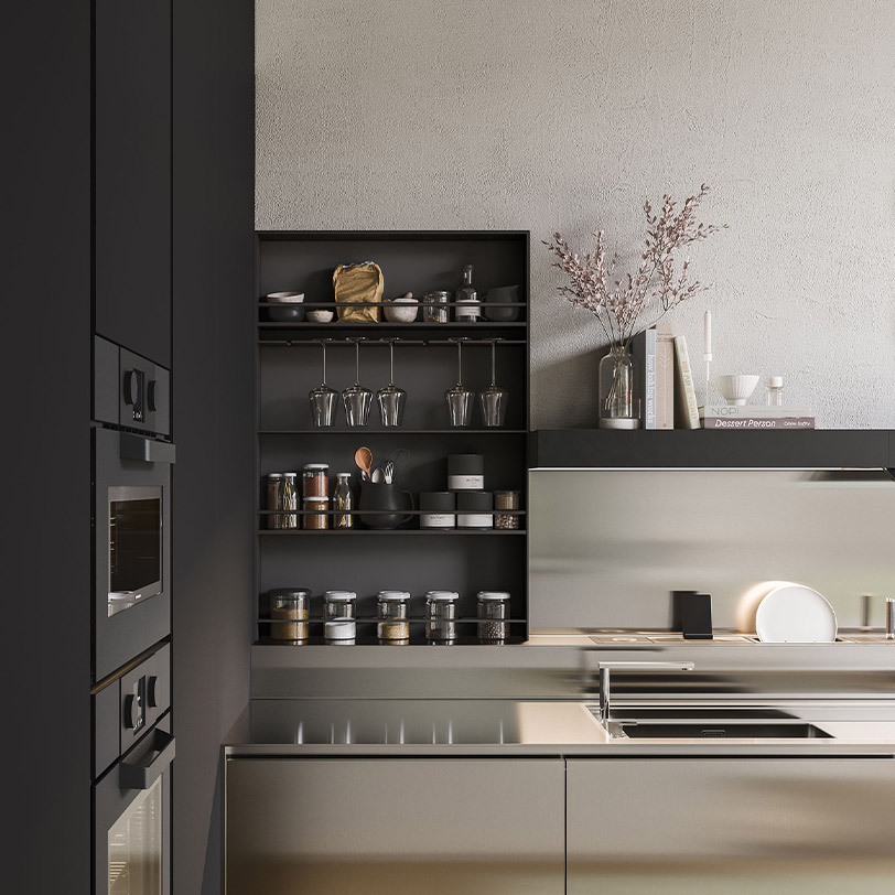 The open metal shelving units Holder represent a fundamental design component for innovative solutions that seamlessly integrate across kitchen and living area environments. Thanks to their versatility, they can be used as connecting and supporting elements on a wall panel or between countertops and floor bases. Strength, customization, defined geometries, and storage capacity are the main features of this special element, known for its impeccable durability.